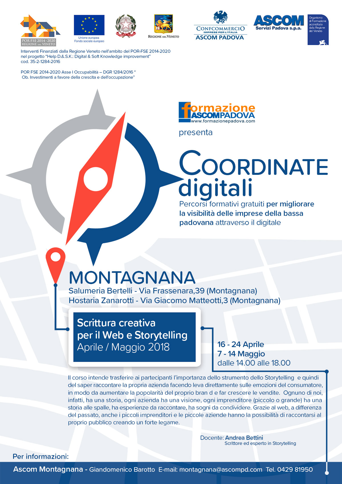 Tra aprile e maggio a Montagnana si terranno quattro incontri completamente gratuiti grazie al progetto “COORDINATE DIGITALI”, finanziato dalla Regione Veneto e organizzato in collaborazione con Confcommercio Ascom Padova e la sua area dedicata alla Formazione.