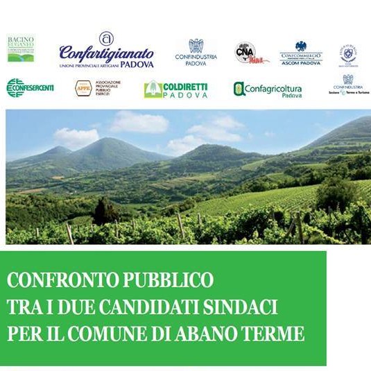 Martedì 20 giugno a partire dalle 20,30, nella Sala Congressi dell’Hotel Alexander ad Abano Terme, si terrà l’incontro promosso dalle Categorie Economiche del Bacino Euganeo con i due candidati sindaco del Comune di Abano Terme, che si affronteranno al ballottaggio di domenica 25 giugno.