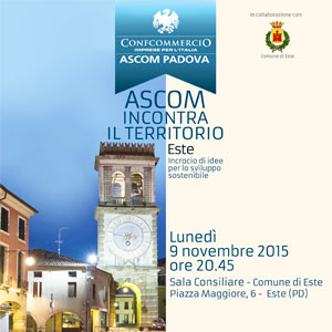 Questa sera lunedì 9 novembre, alle 20,45 presso la Sala Consiliare del Comune di Este è previsto il sesto appuntamento della serie di consultazioni che l’Ascom ha avviato prima dell’estate e che completerà, entro il 2015, con il coinvolgimento di tutti i mandamenti della provincia.