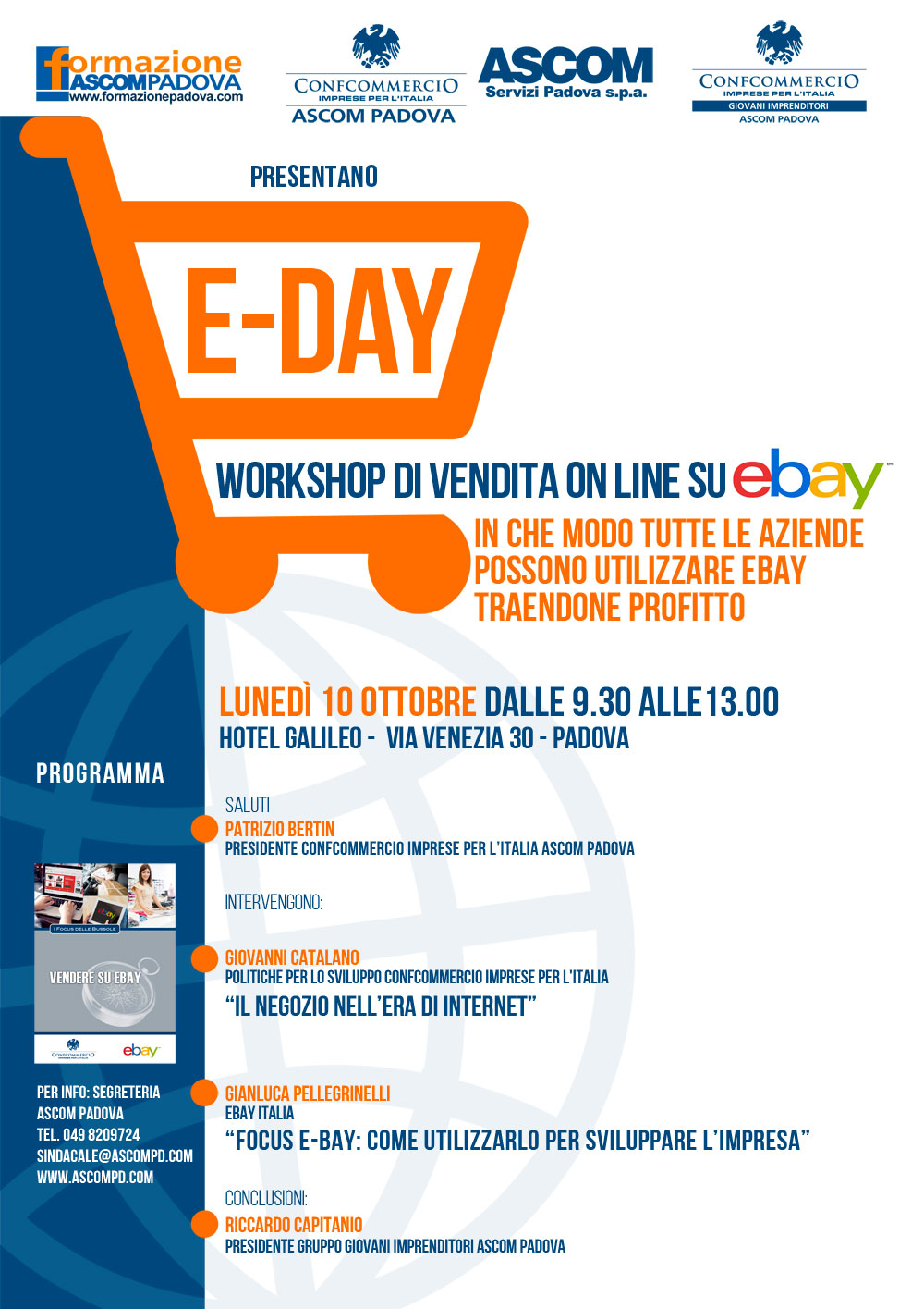 Sold out per l’importante workshop di vendita on line su Ebay dal titolo “E-DAY. In che modo tutte le aziende possono utilizzare Ebay traendone profitto”, realizzato grazie ad una grande sinergia tra Confcommercio Ascom Padova, Formazione Ascom Padova, Confcommercio Nazionale e il Gruppo Giovani Imprenditori e che ha avuto luogo presso l’Hotel Galileo di Padova.