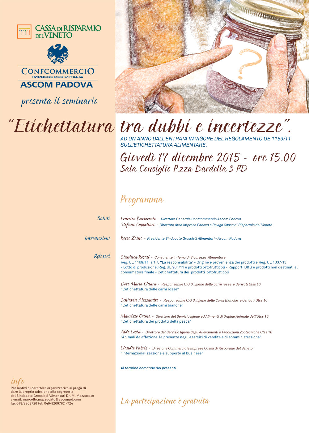 Nel corso del convegno si alterneranno gli interventi di Gianluca Rosati, consulente in tema di sicurezza alimentare, Maria Chiara Bovo, Alessandro Schiavon e Maurizio Crema, esperti dell’Ulss 16, con il contributo finale di Claudio Fabris della Direzione Commerciale Imprese della Cassa di Risparmio del Veneto.