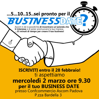 “BUSINESS DATE”, LO SPEED DATE PER LE AZIENDE IN CERCA DI BUSINESS VA IN SCENA ALL’ASCOM IL 2 MARZO CON LO SLOGAN “CREA IL TUO BUSINESS IN 15 MINUTI”