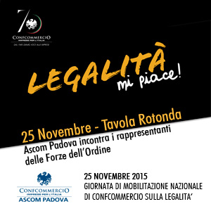 IN OCCASIONE DELLA MANIFESTAZIONE NAZIONALE DI CONFCOMMERCIO “LEGALITA’, MI PIACE”: OGG, 25 NOVEMBRE, ALLE 13.30, NELLA SEDE PROVINCIALE DELL’ASCOM IN PIAZZA BARDELLA A PADOVA IL CONFRONTO CON I RAPPRESENTANTI LOCALI DELLE FORZE DELL’ORDINE SUI FENOMENI CRIMINALI CHE OSTACOLANO LE IMPRESE DEL COMMERCIO, DEL TURISMO E DEI SERVIZI.