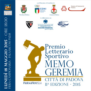 Oggi Lunedì 18 maggio dalle ore 18,30 presso il Pad.8 – PalaAscom Antonio Zaglia, presidente del gruppo Librai Ali Ascom Padova e il prof. Dino Ponchio, dirigente CONI, presentano la seconda edizione del Premio Letterario Sportivo Città di Padova “Memo Geremia”, assieme ai membri della giuria e del comitato organizzatore del premio, nato l’anno scorso con lo scopo di diffondere e valorizzare i valori ideali e culturali legati allo sport, promuovere la lettura ed infondere i principi di passione e sportività improntati all’esempio nobile di Memo Geremia, grande esponente del mondo dello sport padovano, oltre che grande figura di uomo, assieme ai membri del comitato organizzatore e della giuria tecnica, tra cui sportivi olimpionici e giornalisti.