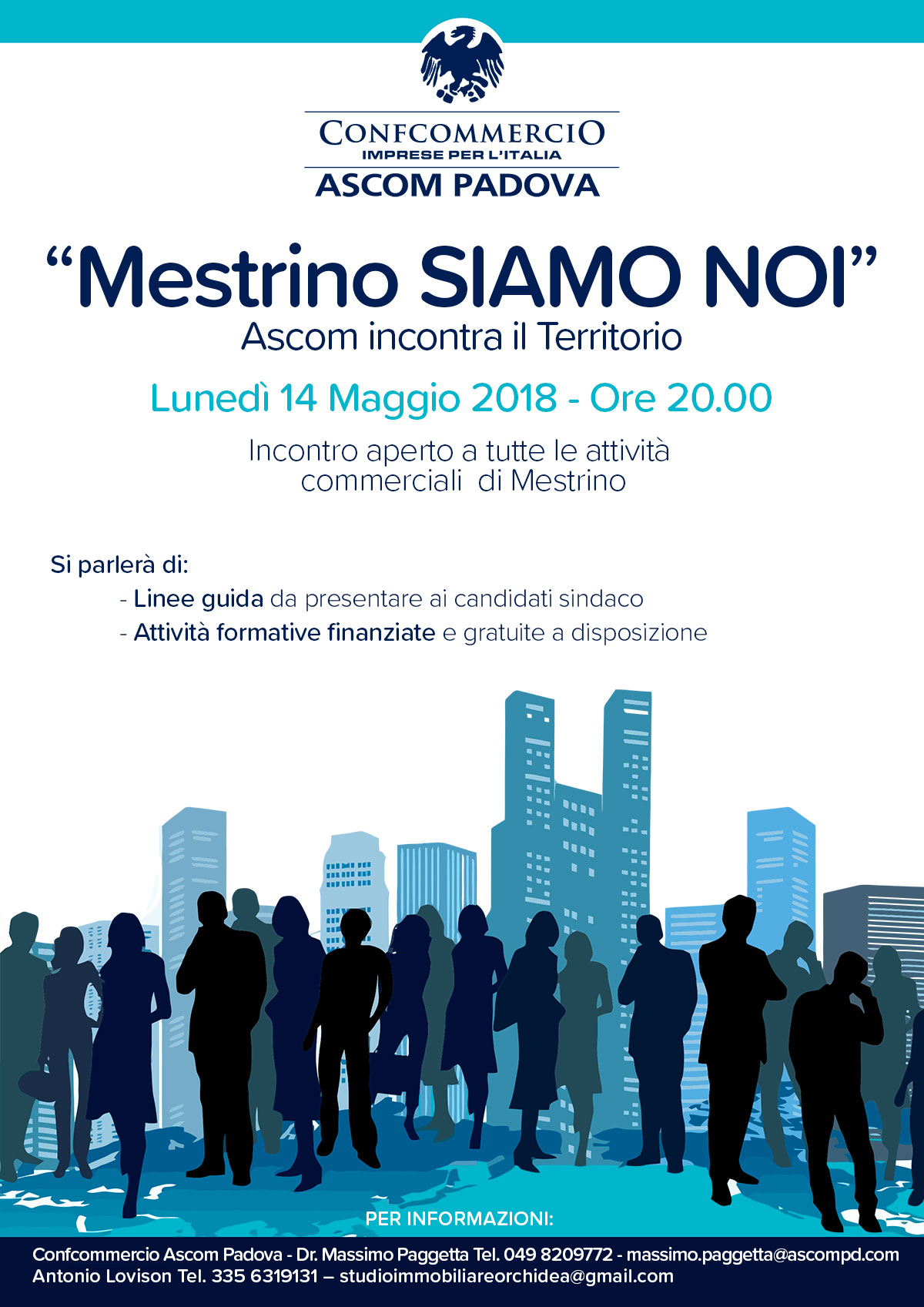 In questa occasione Confcommercio Ascom ha convocato una riunione per lunedì 14 maggio alle ore 20.00 nella Sala delle Associazioni n. 2 presso il Comune di Mestrino in Piazza IV Novembre al civico 30.