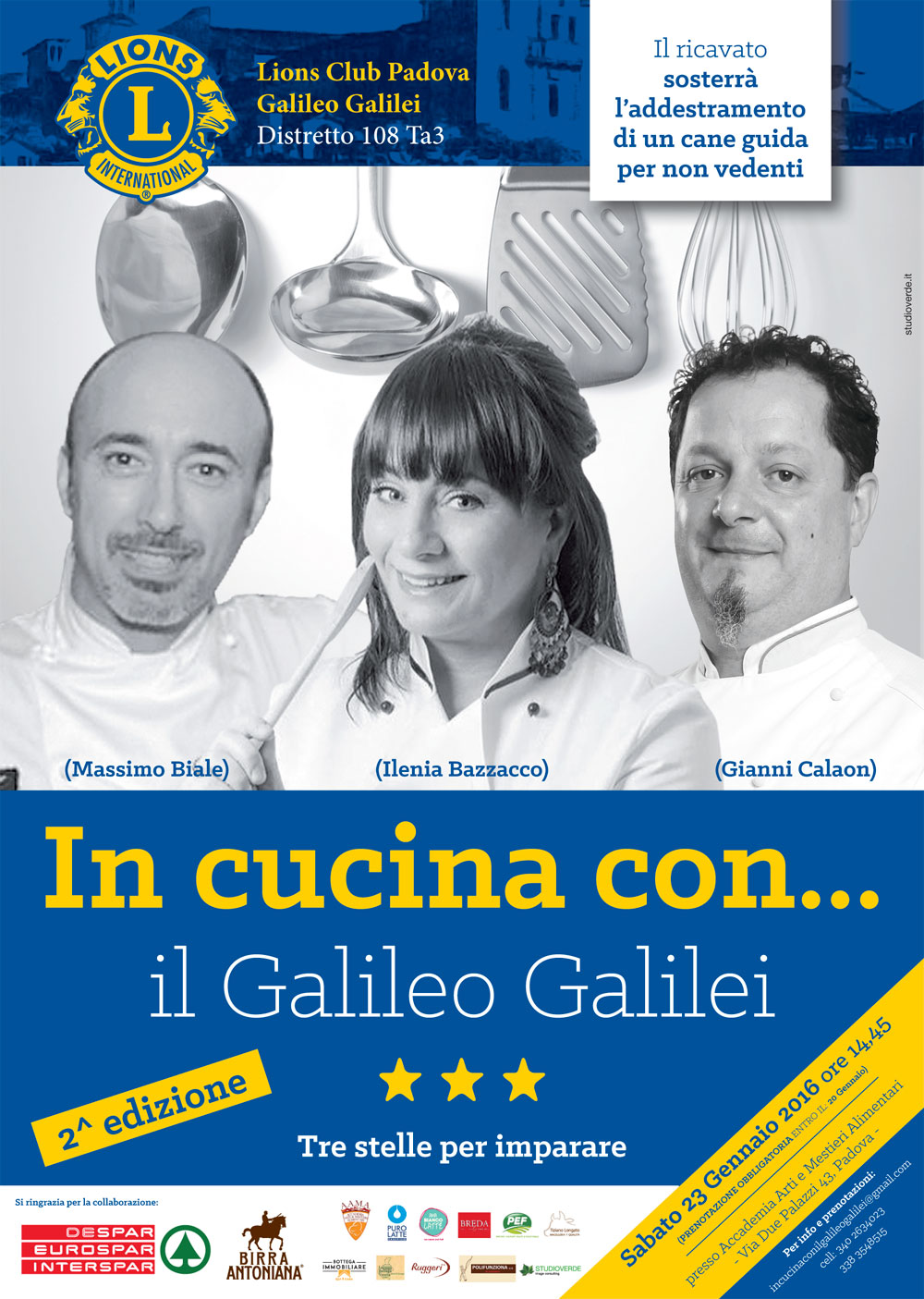 Con un ricco programma e il prestigio di tre chef stellati torna per il secondo anno consecutivo sabato 23 gennaio dalle ore 14,45 l’evento “In cucina con Galileo Galilei: tre stelle per imparare”, organizzato dal Lions Club Padova Galileo Galilei (l’ultimo Lions Club nato in città e nel Distretto) presso l’Accademia Arti e Mestieri Alimentari di Ascom Padova in Via Due Palazzi 23, che metterà a disposizione di questa manifestazione, che ha peraltro finalità benefica, la propria struttura con tutta la strumentazione di avanguardia che viene utilizzata quotidianamente per la formazione d’aula.