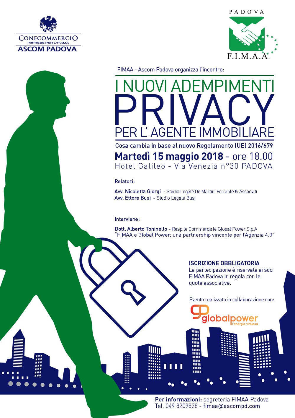 Cosa cambia in base al nuovo Regolamento UE 2016/679 in merito ai nuovi adempimenti sulla privacy per gli Agenti Immobiliari?L’occasione per approfondire questo importante e delicato argomento si presenta martedì 15 maggio alle ore 18,00 nel corso del seminario organizzato da FIMAA Ascom Padova per i suoi soci presso l’Hotel Galileo, Via Venezia 30, Padova.