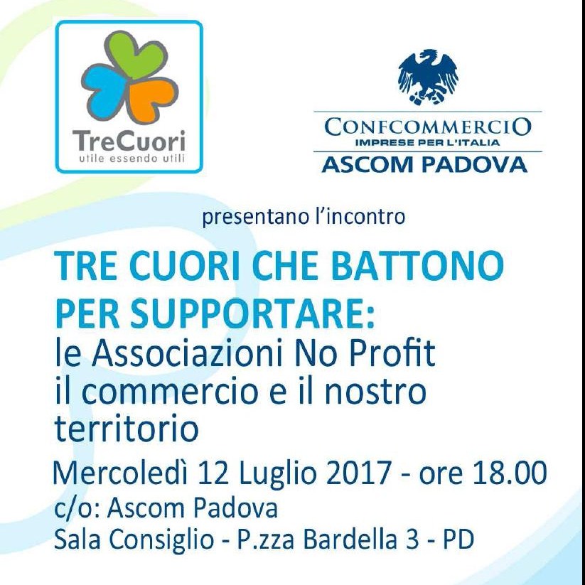Mercoledì 12 luglio alle ore 18.00 presso l’Ascom di Padova, Piazza Virgilio Bardella 3, verrà presentato il progetto TreCuori alle Associazioni Non Profit e alle PMI, che rappresentano l’ossatura sociale ed economica del territorio.