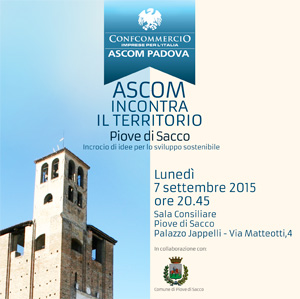 Questa sera lunedì 7 settembre, alle 20,45 presso la Sala consigliare del Comune di Piove di Sacco (Palazzo Jappelli) è previsto il terzo appuntamento della serie di consultazioni che l’Ascom ha avviato prima dell’estate e che ha in programma di completare, da qui ad un paio di mesi, con il coinvolgimento di tutti i mandamenti della provincia.