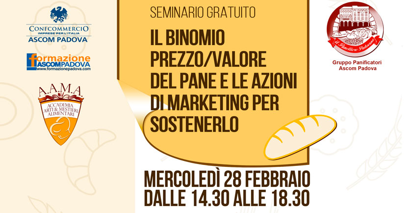 “Il binomio prezzo / valore del pane e le azioni di marketing per sostenerlo”: questo il tema che verrà affrontato nel corso del seminario gratuito valido per il percorso formativo di aggiornamento professionale previsto dalla legge regionale 2013 e rivolto ai panificatori soci di Ascom Padova e che si terrà nella sede Confcommercio di Piazza Bardella.Dopo l’introduzione di Carlo Quartesan, presidente del gruppo Panificatori, si alterneranno i contributi della dr.ssa Roberta Parollo, consulente di marketing e comunicazione, che parlerà della differenziazione nell’assortimento dei servizi offerti, e del dr. Davide Barollo, dell’Ufficio Marketing Ascom Padova, che tratterà dell’investimento nella comunicazione.