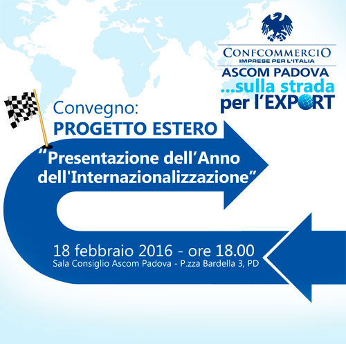 Con l’obiettivo di fare del 2016 l’anno dell’internazionalizzazione, l’associazione, col contributo di Padova Promex, apre ai propri associati le porte dell’export. Obiettivo: aiutare le aziende in un percorso guidato di crescita che risponde ad esigenze di mercato sempre più ineludibili, e lo fa con una serie di tappe formative la prima delle quali è in programma per giovedì prossimo, 18 febbraio alle 18, nella sede Ascom di Piazza Bardella, alla Stanga.