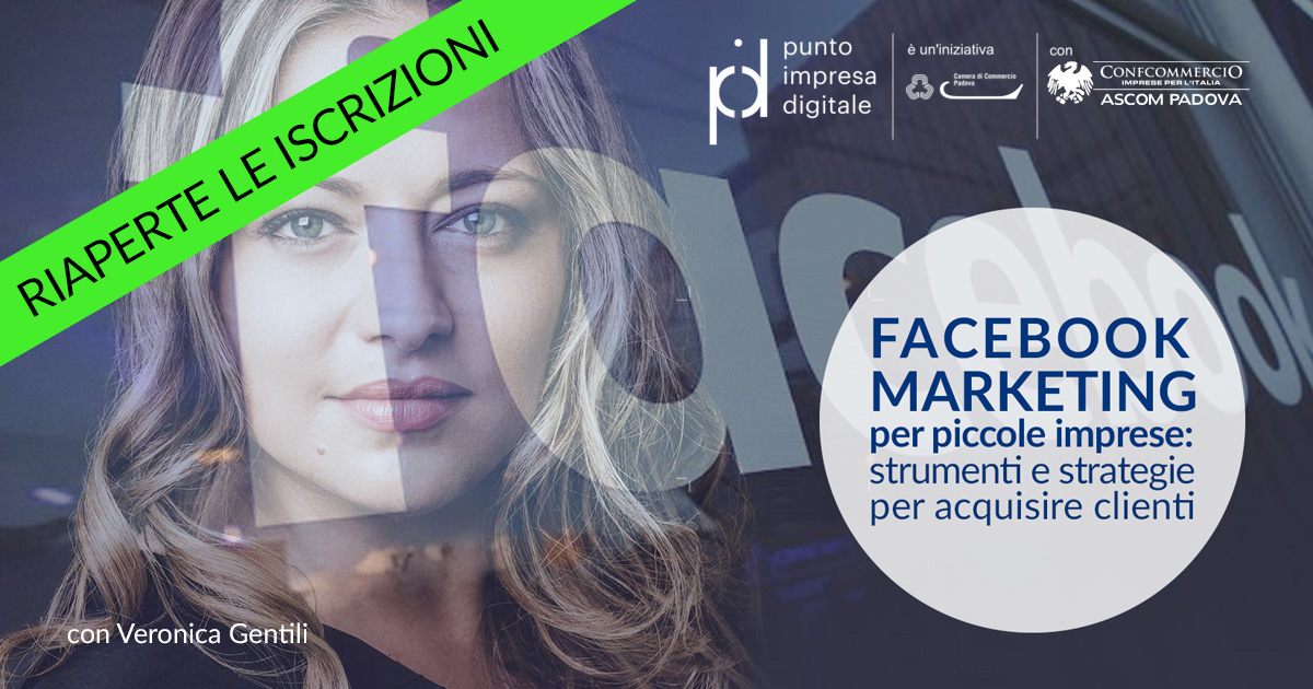 Vista la numerosa richiesta, sono riaperte le iscrizioni al webinar “FACEBOOK MARKETING PER LE PICCOLE IMPRESE: STRUMENTI E STRATEGIE PER ACQUISIRE CLIENTI”.