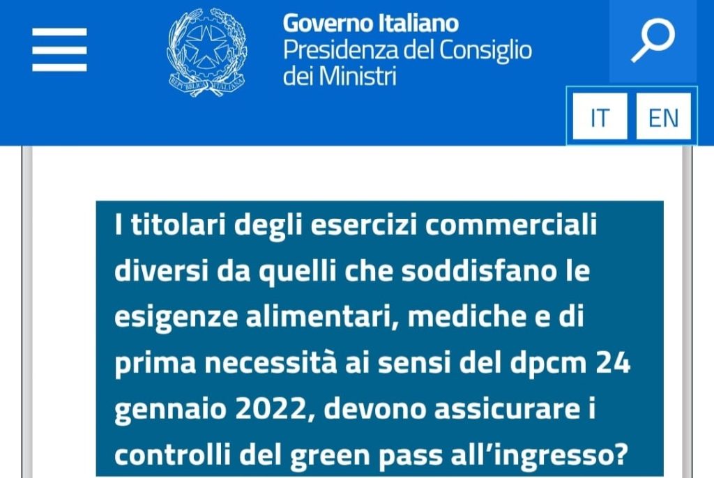 FAQ LINEE GUIDA GREEN PASS E ACCESSO AI NEGOZI DAL 1° FEBBRAIO 2022