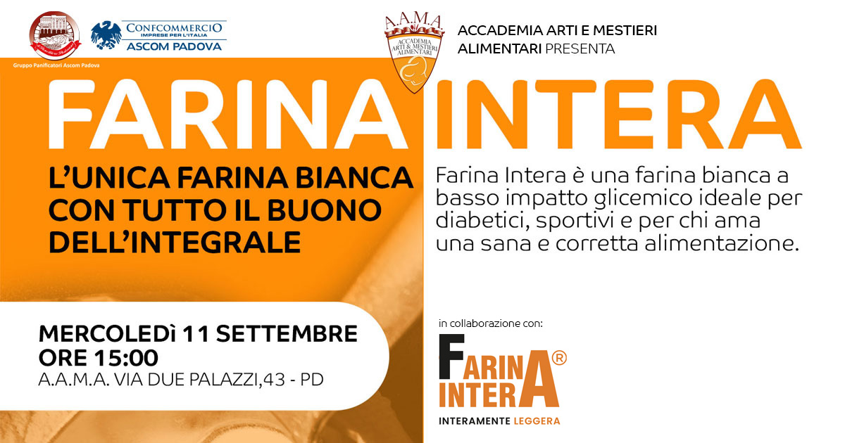 E’ previsto per mercoledì 11 settembre alle ore 15.00 presso l’Accademia Arti e Mestieri Alimentari AAMA – Via Due Palazzi 43, il corso proposto dal Gruppo Panificatori di Confcommercio Padova dedicato a Farina intera, una farina bianca a basso impatto glicemico ideale per diabetici, sportivi e per chi ama una sana e corretta alimentazione.