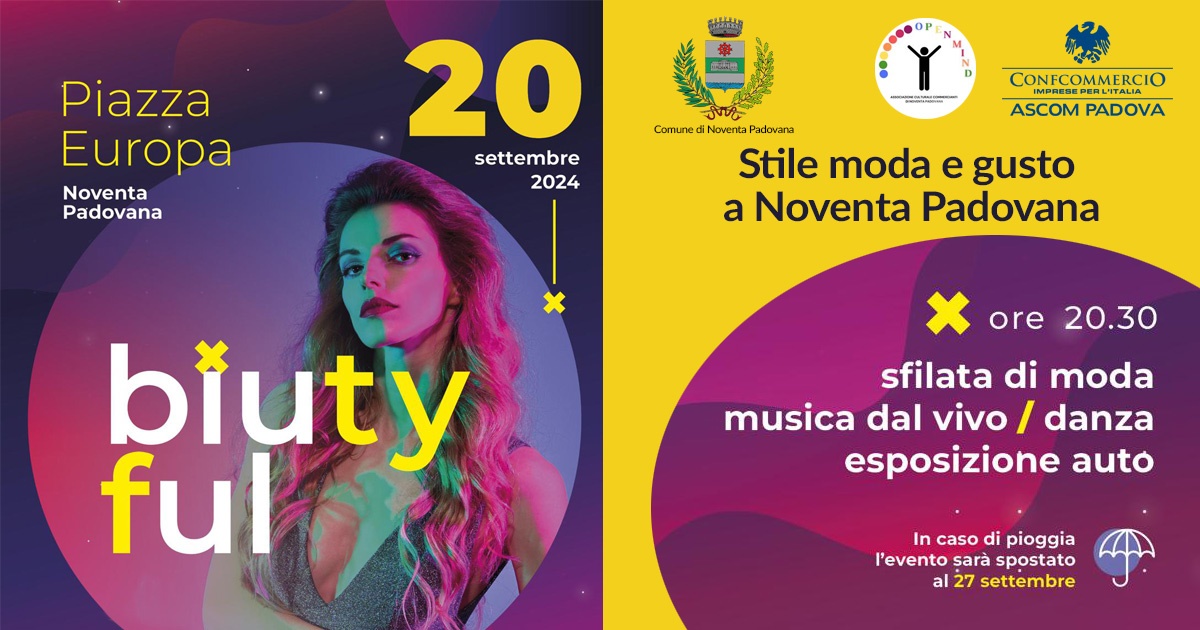 Venerdì 20 settembre, alle 20.30, a Noventa Padovana è di scena “Biutyful” la sfilata “Style, Moda e Gusto” organizzata dall’Associazione Open Mind che riunisce una quarantina di commercianti noventani e dei comuni limitrofi