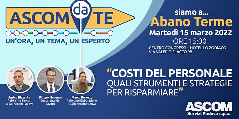 “Costi del personale, quali strumenti e strategie per risparmiare”: questo il tema dell’incontro aponense, in programma alle ore 15 ed al quale interverranno, in veste di esperti, Enrico Rizzante, referente dei servizi legali dell’Ascom Confcommercio; Filippo Noventa, consulente del lavoro e Marco Perozzo, referente elaborazione paghe dell’Ascom Confcommercio.