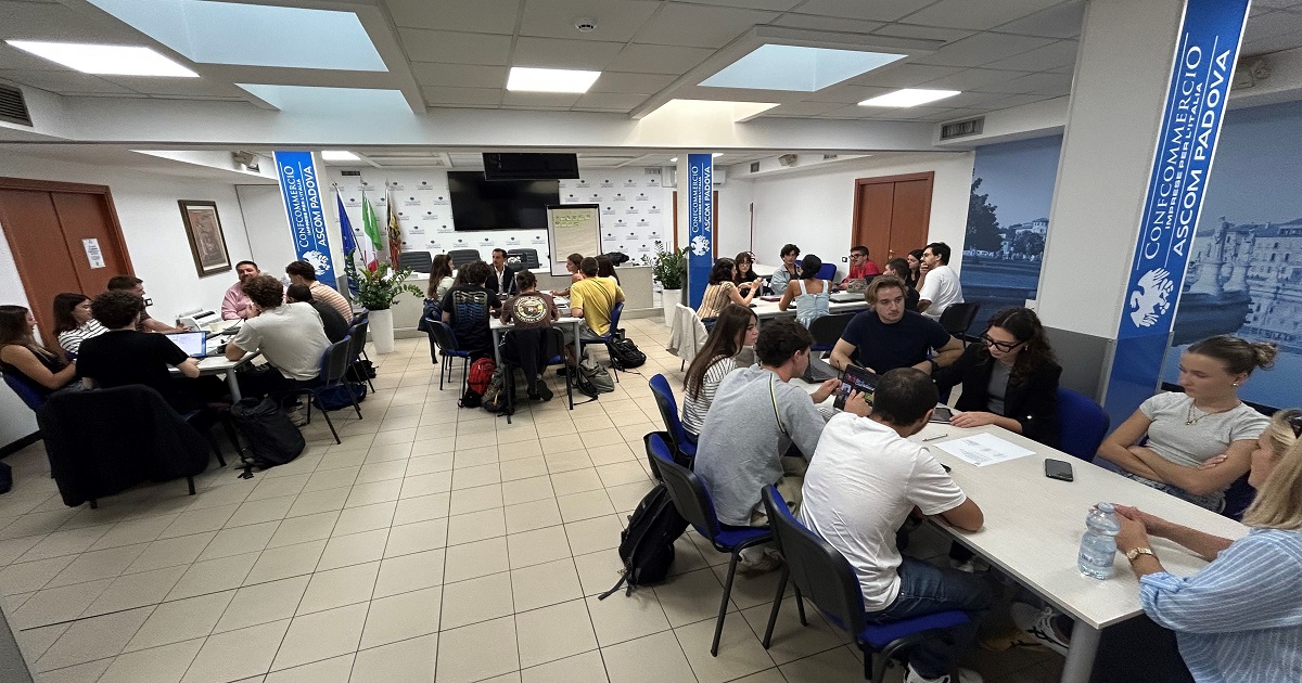 A seguire i giovani e i titolari d’azienda in questo laboratorio che ha trasformato la sala consiglio dell’Ascom Confcommercio di piazza Bardella in un’aula universitaria di stampo anglosassone, oltre allo stesso Busato, i tutor Marco Selmin, Alice Azzollin, Francesco Bruno Angeloni, Matteo Braghin e Marco Bacchin.
