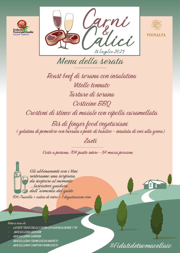 Nel cuore dell’estate e dei Colli Euganei, nella splendida cornice dell’Azienda Agricola Vignalta, il Sindacato dei Macellai di Confcommercio Ascom Padova ha organizzato per mercoledì 16 luglio a partire dalle 19:30 una serata di degustazione interamente dedicata alla scoperta di nuovi abbinamenti e presentazioni per i piatti della tradizione.