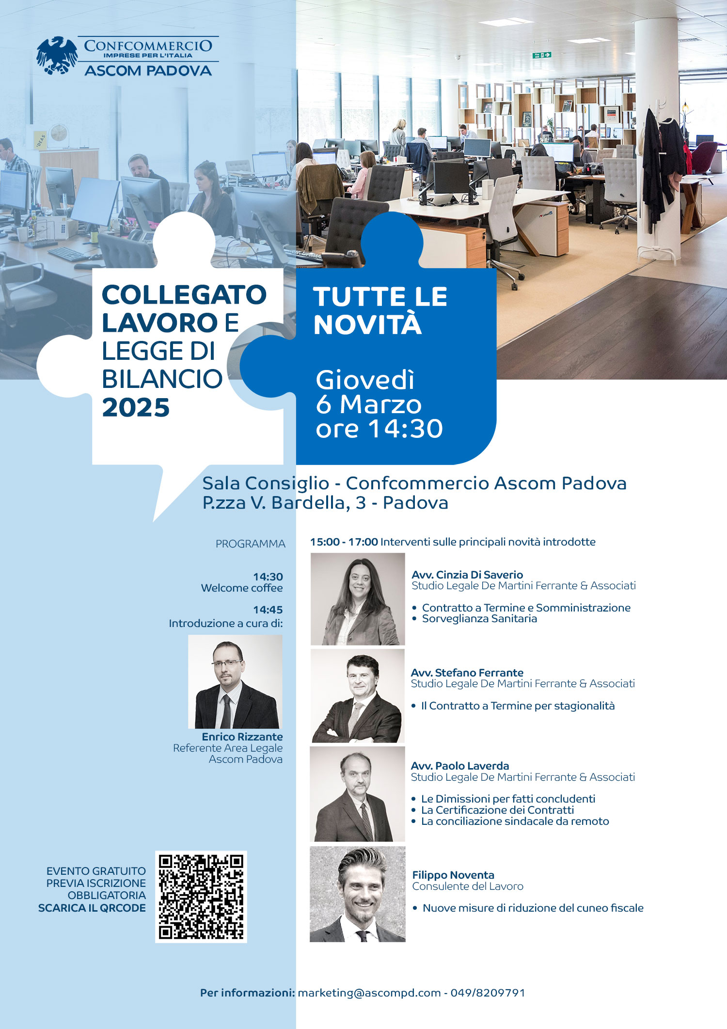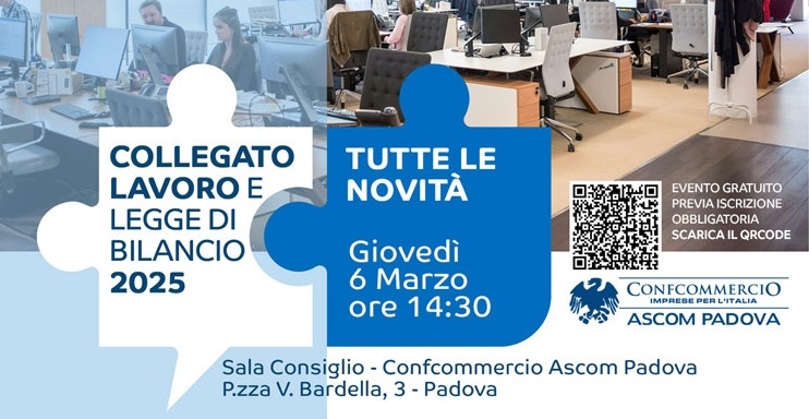 Ecco allora la pertinenza del webinar organizzato da Confcommercio Ascom Padova per domani, giovedì 6 marzo, alle 14.30, sul tema “Collegato lavoro e legge di bilancio 2025: tutte le novità”.