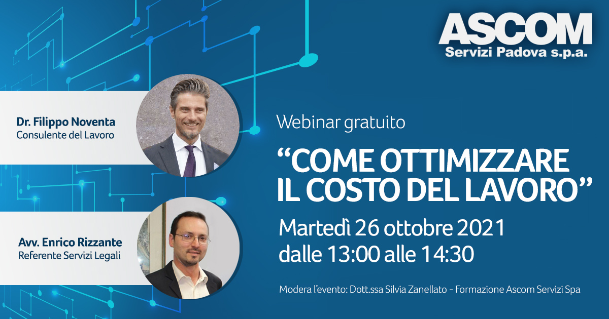L’Ascom Servizi Padova, in collaborazione con la Camera di Commercio di Padova nell’ambito del progetto MENTORE, organizza il webinar gratuito “COME OTTIMIZZARE IL COSTO DEL LAVORO”, martedì 26 ottobre dalle 13.00 alle 14.30.