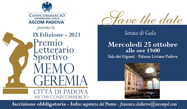 E venne il giorno del gran finale della IX Edizione del Premio Letterario Sportivo “Memo Geremia” organizzato dall’Ascom Confcommercio di Padova e che oggi, mercoledì 25 ottobre, a partire dalle 19, nella Sala dei Giganti a Palazzo Liviano, nel corso della serata di gala, vedrà la premiazione dei vincitori usciti dopo un impegnativo e lungo lavoro di letture e selezioni della giuria tecnica del Premio presieduta da Rossano Galtarossa.