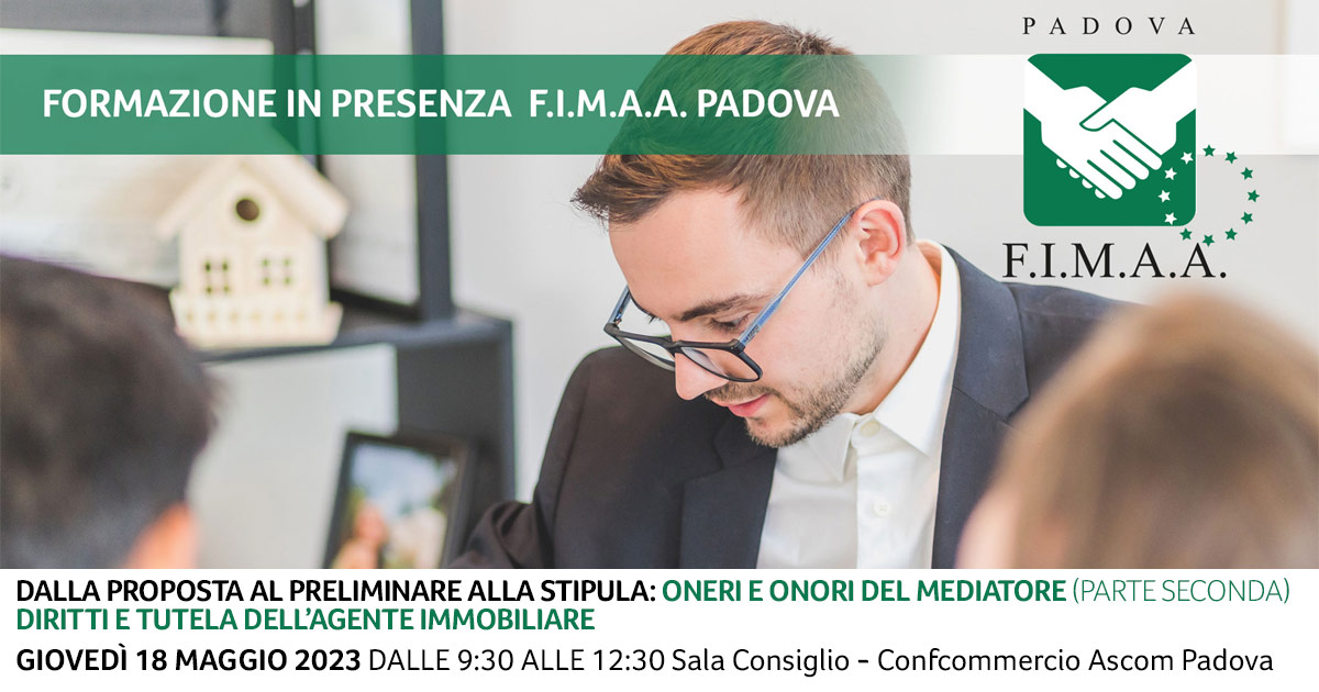 E’ prevista per giovedì 18 maggio alle ore 9,30 alle 12.30 la seconda parte del percorso formativo avente per tema “I diritti e la tutela dell’Agente Immobiliare. Oneri e onori del mediatore: dalla proposta al preliminare alla stipula” che si terrà nella in sala consiglio dell’Ascom Confcommercio di Padova in piazza Bardella 3.