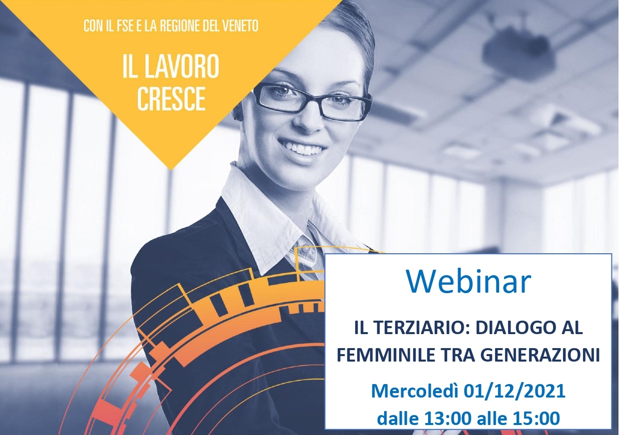 Mercoledì 1 dicembre 2021 dalle ore 13.00 alle ore 15.00 è in programma il webinar gratuito “IL TERZIARIO: DIALOGO AL FEMMINILE TRA GENERAZIONI”, organizzato da Ascom Servizi Padova Spa, nell’ambito dei progetti finanziati dalla Regione Veneto con il FSE (direttiva 526/2020) “Il Veneto delle donne”.
