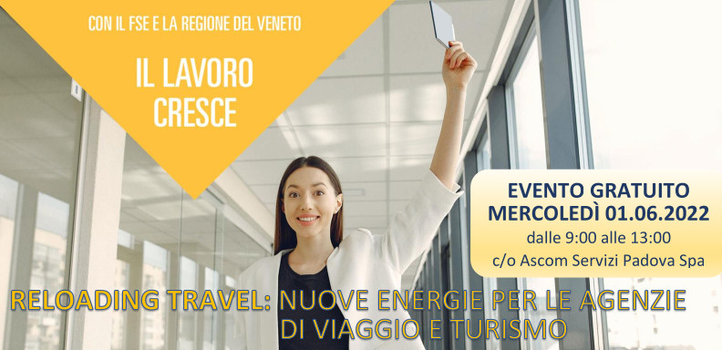 Un evento in presenza  realizzato nell’ambito del RELOADING TRAVEL: NUOVE ENERGIE PER LE AGENZIE DI VIAGGIO E TURISMO  da Ascom Servizi Spa (prog. POR – FSE per il rilancio del turismo in Veneto) si terrà mercoledì 1° giugno dalle ore 9.00 alle ore 13.00 nella sala Consiglio di Ascom Padova (Piazza Bardella 3).