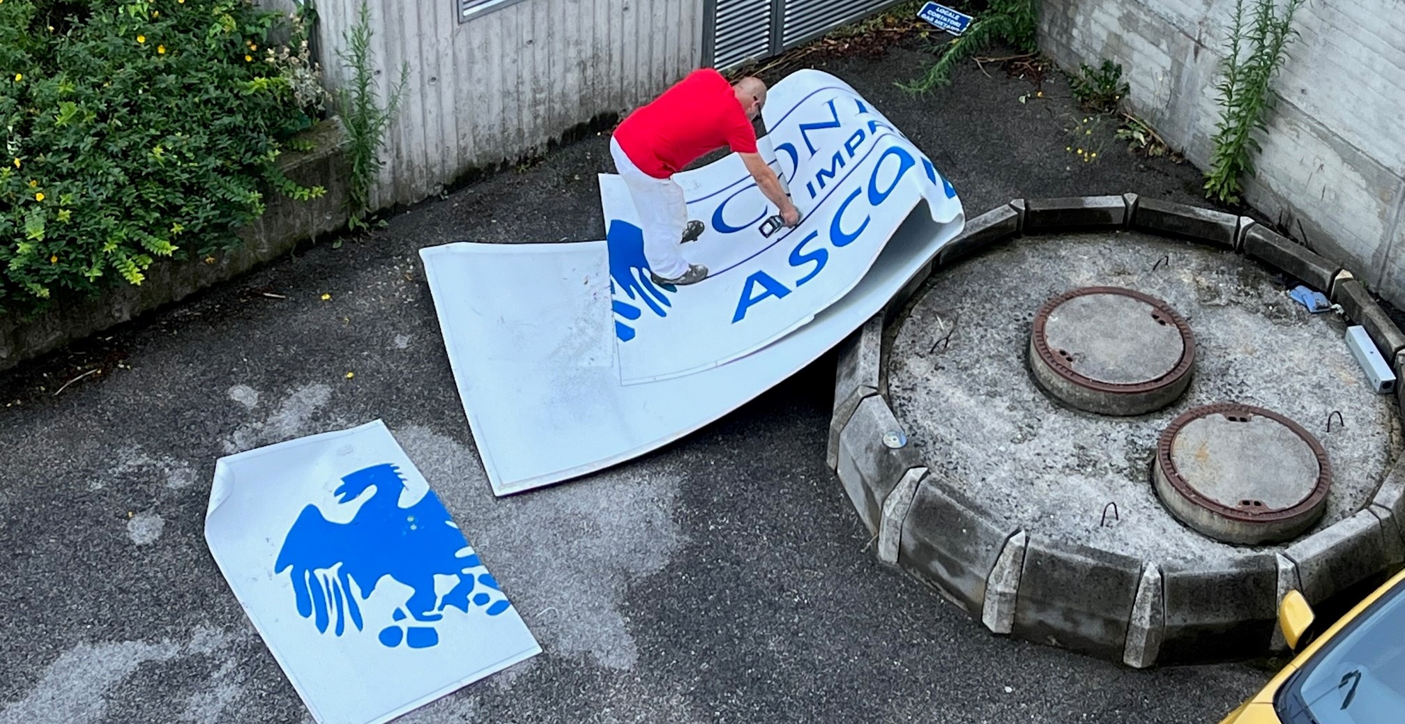 Il forte vento ha infatti abbattuto le due grandi insegne installate nei lati nord e est con non poca apprensione, a causa del rumore assordante causato dalla caduta dei due grandi manufatti, per il gruppo di corsisti che, in quel momento, stavano svolgendo, nelle aule al piano terra, una lezione del corso di somministrazione e vendita di prodotti alimentari.