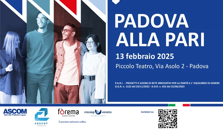 Giovedì 13 febbraio alle 17, al Piccolo Teatro (via Asolo 2 – Padova) l’evento conclusivo di “Padova alla Pari” dedicato alla presentazione del protocollo di rete territoriale per la parità di genere della provincia di Padova