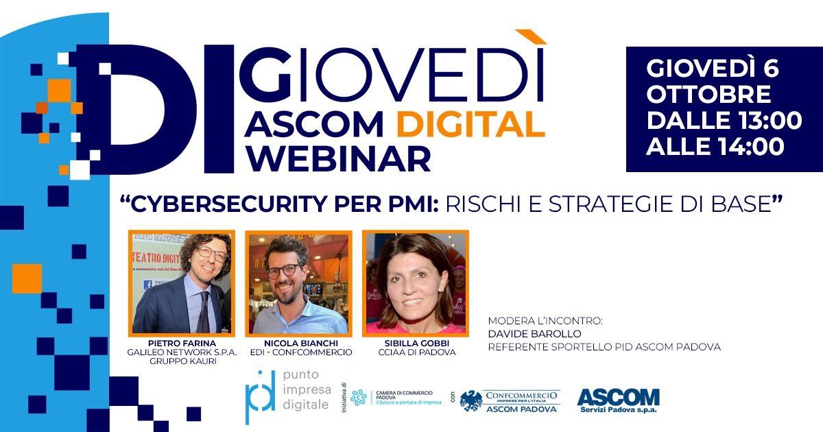 Si terrà domani giovedì 6 ottobre, durante la pausa pranzo a partire dalle 13.00, il webinar dal titolo “Cybersecurity per PMI: rischi e strategie di base”, organizzato da Ascom Servizi Padova spa in collaborazione con la Camera di Commercio di Padova nell’ambito del progetto PID.