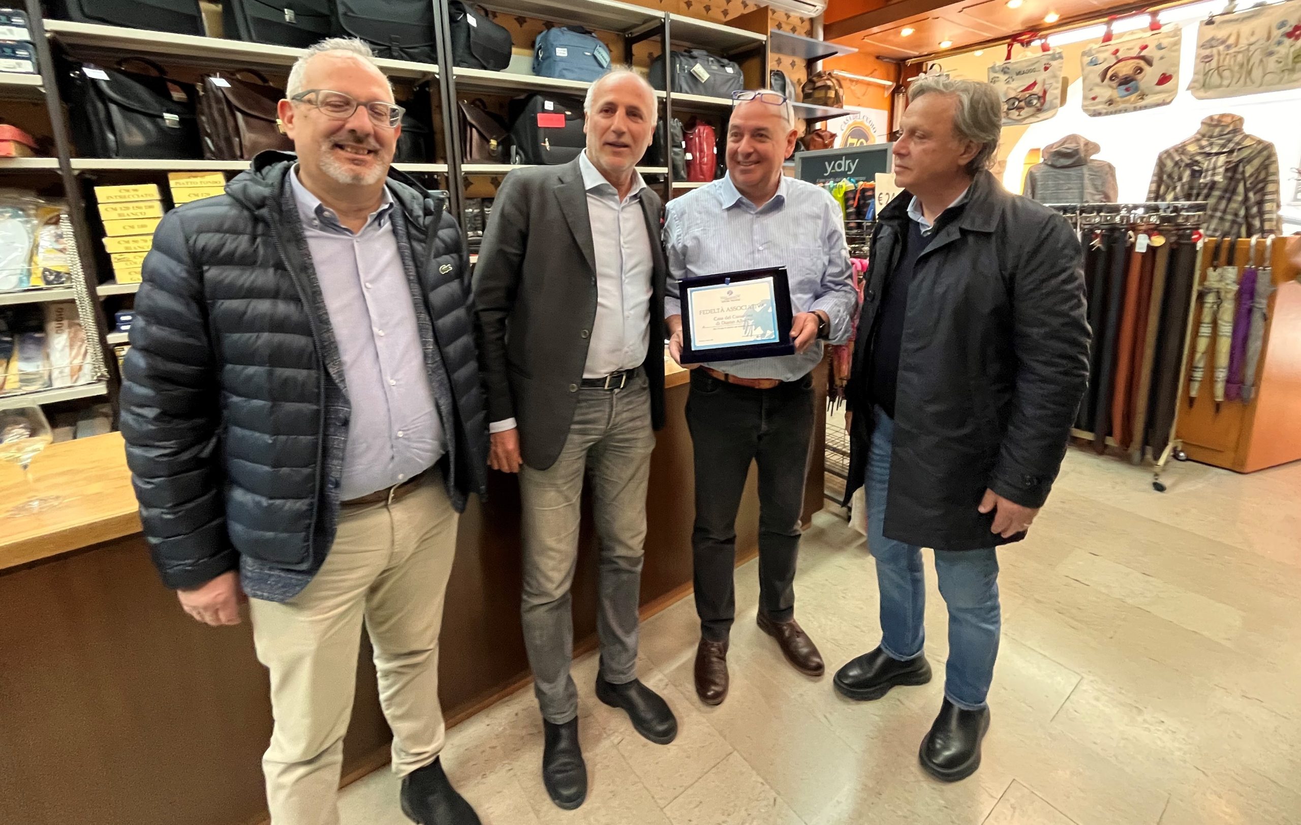 Un traguardo straordinario per una attività commerciale in un centro storico cittadino di questi tempi. E’ questo il golden birthday che festeggia la “Casa del Cuoio”, storica bottega nel cuore di Padova che da anni vende borse, cinture, ombrelli e pelletteria varia e che ha ricevuto dalle mani del presidente di Confcommercio Ascom Padova Patrizio Bertin, assieme all’assessore allo sport Diego Bonavina e al direttore generale Ascom Padova Otello Vendramin, “una targa che riconosce l’enorme valore di questa avventura speciale e che abbiamo l’onore di avere tra i nostri associati, una realtà di cui andare orgogliosi e che testimonia ancora una volta – afferma Bertin – se mai ce ne fosse bisogno, la fondamentale importanza del presidio dei negozi di vicinato per la salvaguardia dei centri cittadini”.